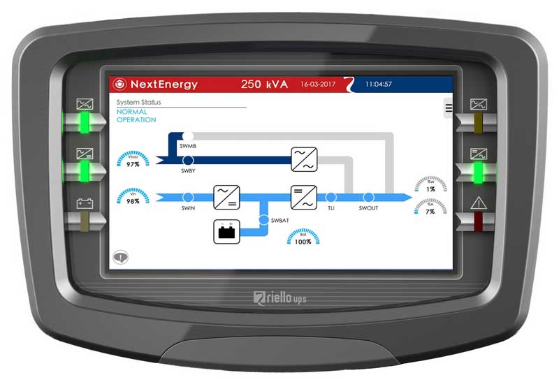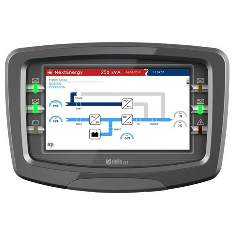 The 7 "color touch screen LCD display, communication slots, relay boards and specific service connectors simplify the configuration, control and supervision of the UPS by making NextEnergy perfectly integral with infrastructure management systems Data Center Infrastructure Management (DCIM) and an ideal solution for the electrical continuity of any IT application.