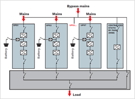 - Decentralised (Distributed) UPS Bypass: each UPS in the power protection system has its own internal static bypass, rated to the maximum capacity of the individual unit. When required to transfer to bypass, the static switch in each UPS turns on simultaneously to share the load.
